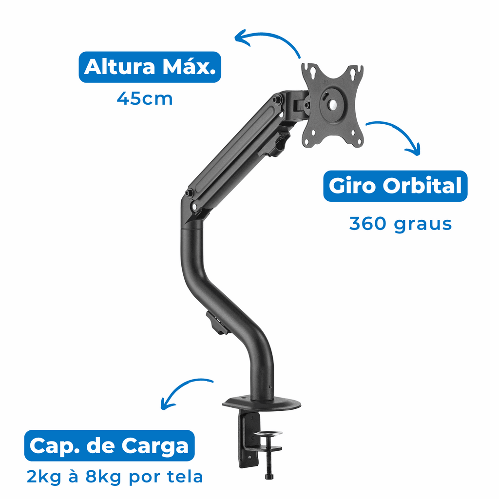 - Altura do eixo VESA: 115 mm a 445 mm (da bancada ao centro do suporte).
