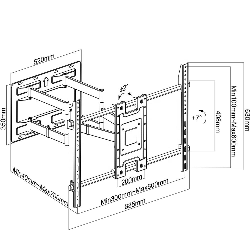 - Compatibilidade VESA: 300x300, 300x400, 400x200, 400x300, 400x400, 600x200, 600x300, 600x400, 800x600 mm.